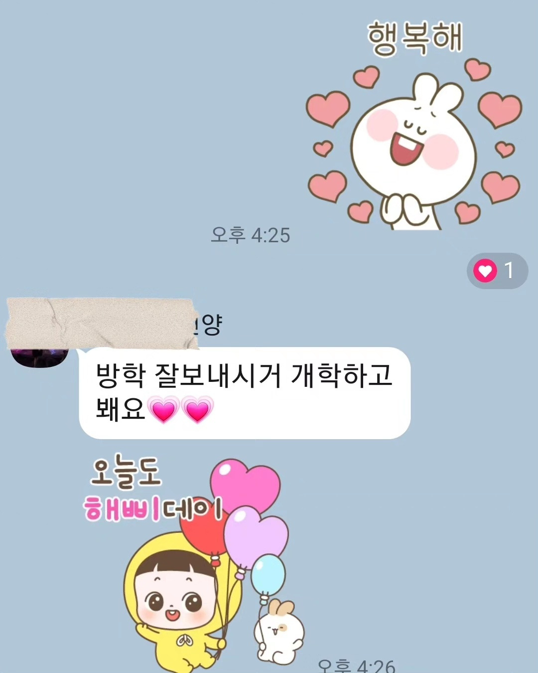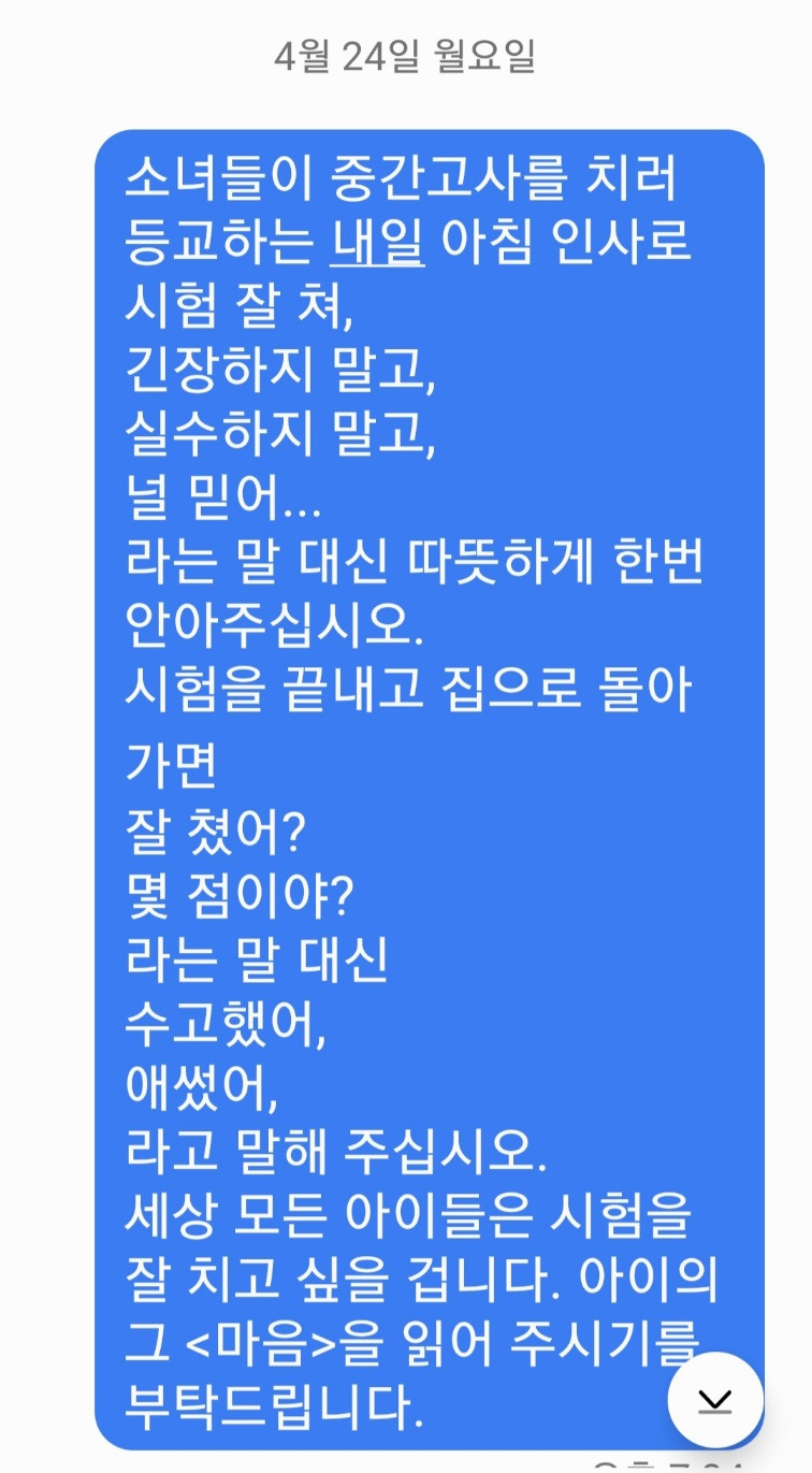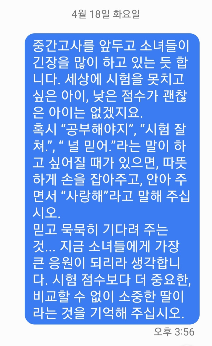 중1 소녀들은 싸우기도 많이 하고 사고도 많이 치지만 최고령 담임을 생각하는 마음이 커서 담임을 많이 예뻐하고 위해준답니다. 이런 문자를 나누기도 합니다.