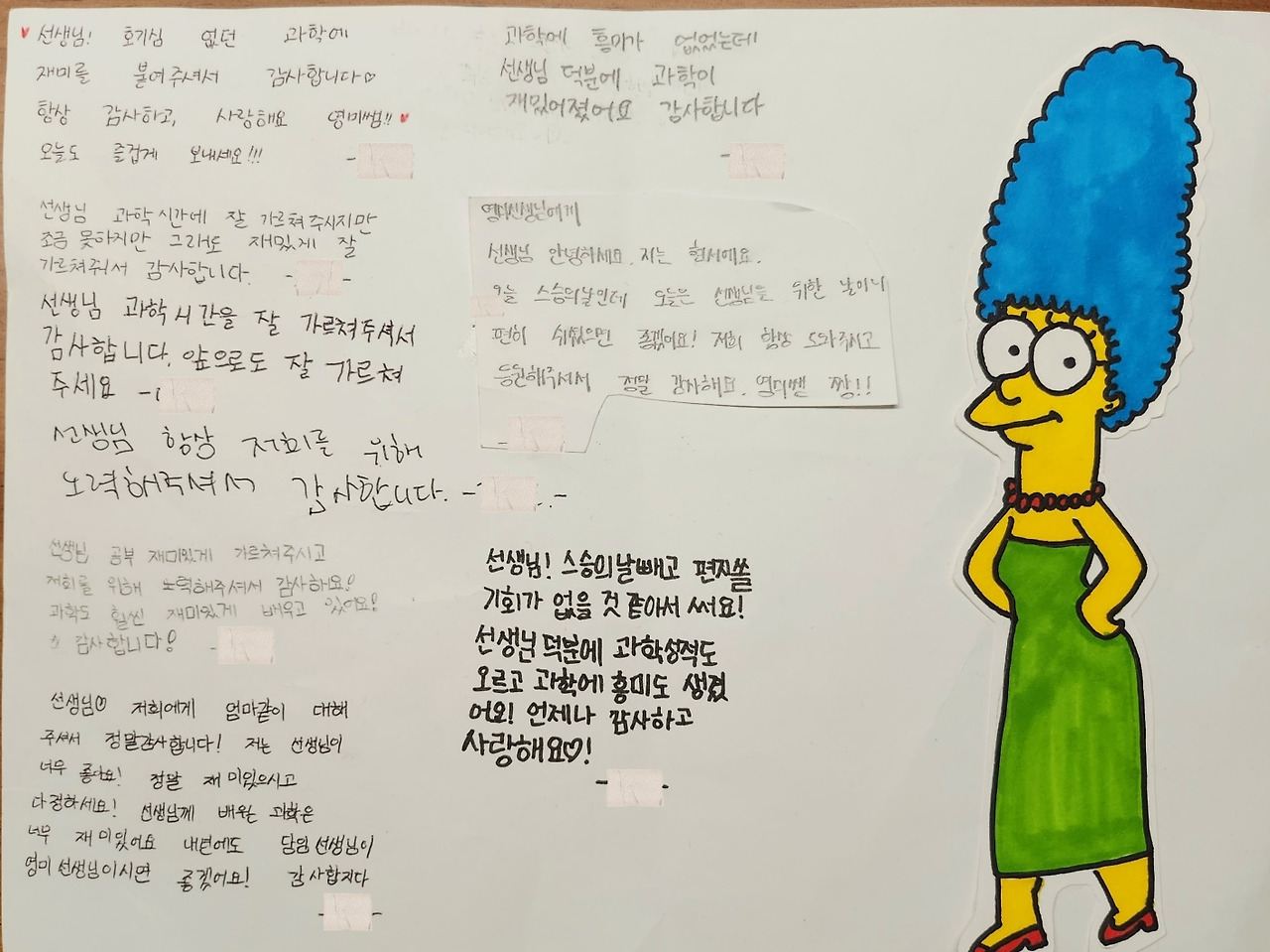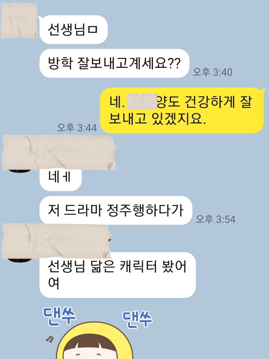 "쌤, 우리 엄마가 쌤한테 배웠대요. 진짜 대에~~ 박."