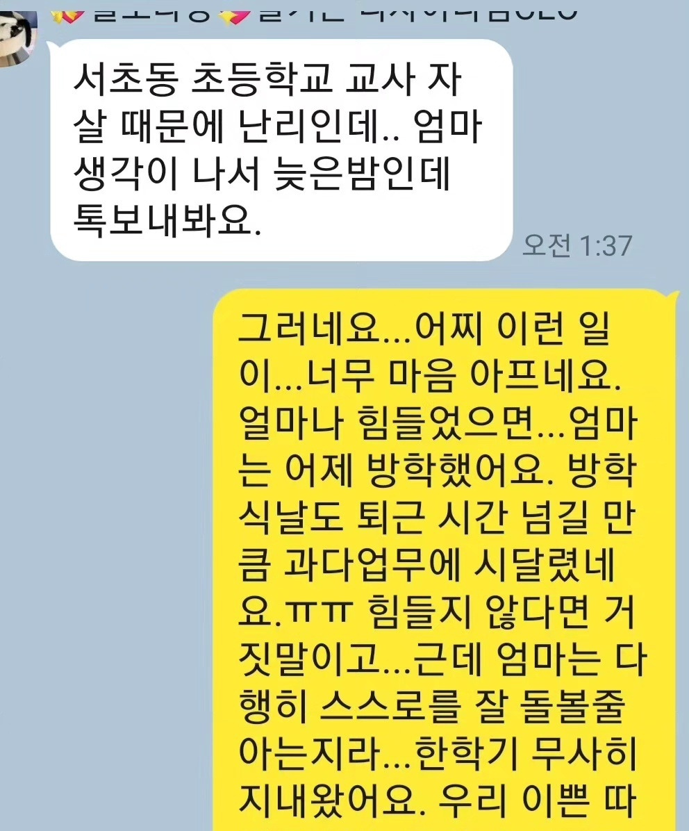 방학식 하는 날 저녁 동료들에게 고마운 마음 전하고 잠들었는데 다음 날 아침에 본 딸의 문자... 그리고 찾아본 기사들... 얼마나 힘들었을까... 얼마나 아팠을까... 그 선생님도 누군가의 소중하고 귀한 딸일 테니... 그 슬픔 어떠하실지...