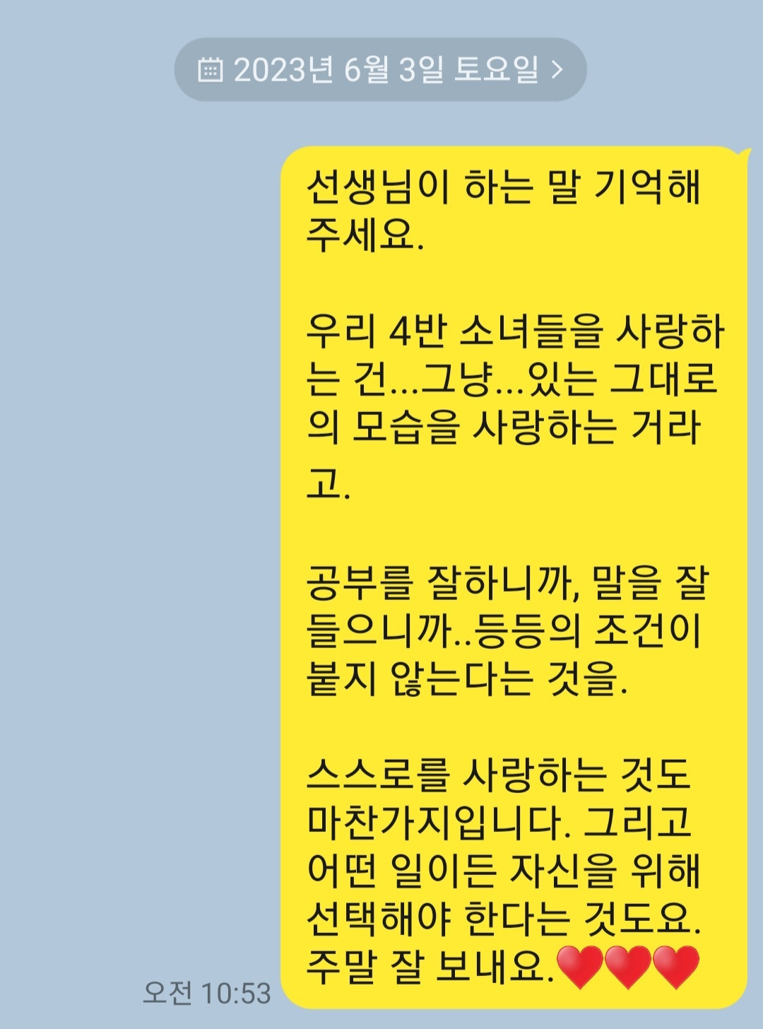 우리 반은 학급 단톡방이 없어 개별 문자를 보냅니다. 카톡을 하지 않는 소녀가 있는 이유도 있지만 단톡방의 필요성을 느끼지 못하고, 가장 큰 이유는 소녀들이 경청하는 태도를 기르기를 바라는 마음에서 입니다.