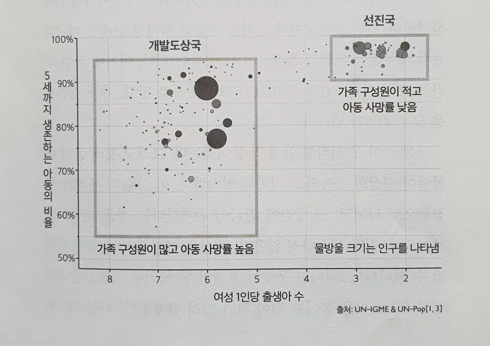 도표에서 왼쪽은 출산율이 높고 오른쪽은 낮습니다. 도표의 위쪽은 아동 생존율이 높고 아래쪽은 낮습니다. 처음 도표는 1965년의 상황이고 두 번째 도표는 2017년입니다. 세계 인구의 6%는 1단계인 개발도상국에 살고 9%는 2~3단계의 나라, 85%는 선진국에서 살고 있습니다.