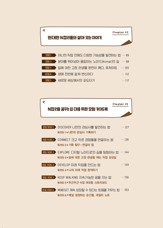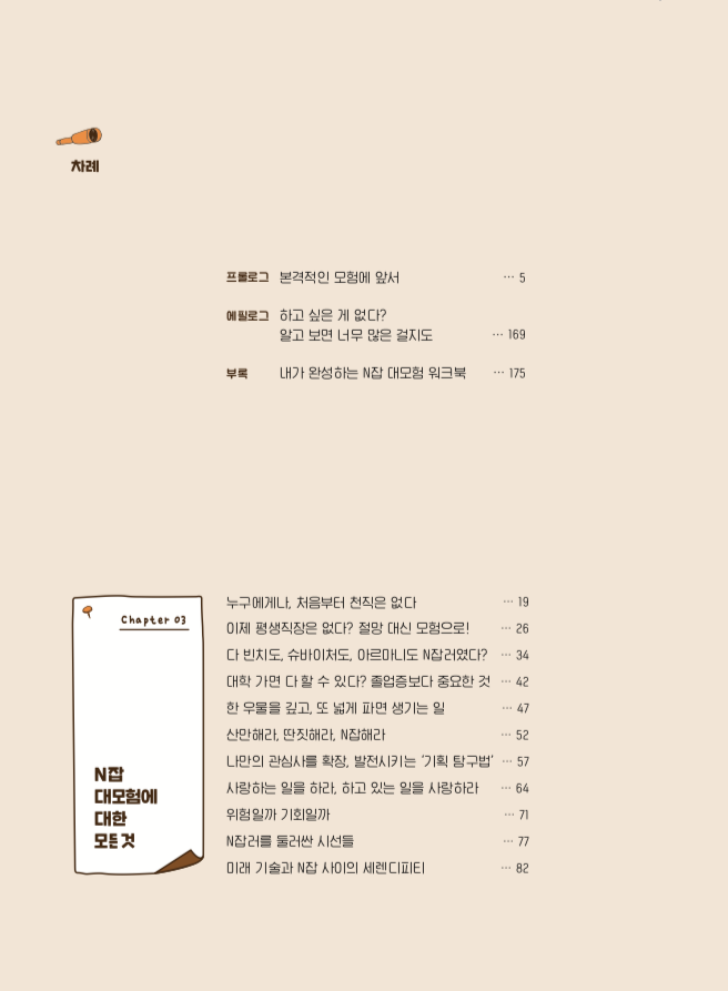 한 강연에서 ‘자신이 하는 일이 가치있다고 느끼는 것에는 심사위원이 필요하지 않다’는 말을 듣고 깊이 공감한 적이 있습니다. 다른 사람의 인정에 앞서 스스로 일에 대해 어떤 가치를 부여하는지가 우선이 되어야 할 것입니다. 일 자체가 주는 순수한 기쁨을 먼저 만끽하며 다양한 기회를 통해 자신의 새로운 가치를 만들어나가며, 함께 작은 성공의 경험을 디딤돌삼아 다음 선택에도 자신감을 갖고 도전해보는 것이죠. 그렇게 <두근두근 N잡 대모험>의 길을 걷고 있는 사람들과 앞으로 그 길을 걸어나갈 우리를 위한 이야기를 지금부터 시작해보겠습니다.