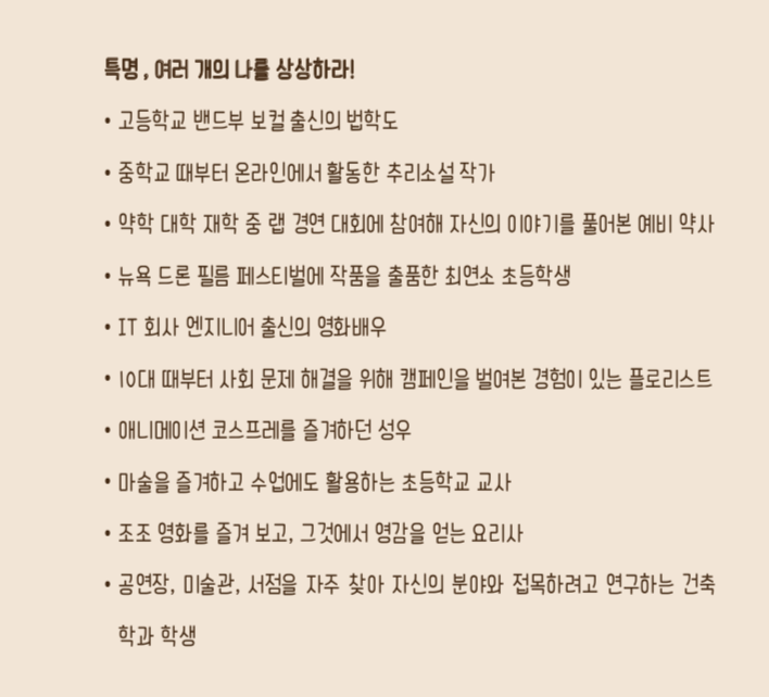 특명 : 여러 개의 나를 상상하라! -고등학교 밴드부 보컬 출신의 법학도 -중학교 때부터 웹에서 활동한 추리소설 작가 -약학대학 재학 중 랩퍼 경연대회에 참여해 자신의 이야기를 풀어본 예비약사 -뉴욕 드론 필름 페스티벌에 작품을 출품한 최연소 중학생 -IT회사 엔지니어 출신의 영화배우 -10대 때부터 사회문제 해결을 위해 캠페인을 벌여본 경험이 있는 플로리스트 -애니메이션 코스프레를 즐겨하던 성우 -마술을 즐겨해 수업에도 활용하는 초등학교 교사 -어릴 때부터 조조영화를 즐겨보고, 그것에서 영감을 얻는 요리사 -공연장, 미술관, 서점을 자주 찾아 자신의 분야와 접목하려고 연구하는 건축학과 학생 앞과 같은 방식으로 상상해 봅시다. 수의사, 소방관, 변호사, 교사, 경찰, 사업가, 배우 등 하나의 직업을 선택한 나의 모습 대신 말이에요. 10대에 해야 할 일은 '여러 개의 나를 상상해보고 그것을 하나씩 그려나가는 것 아닐까' 생각해봅니다. 마치 자신이 주인공인 이야기책을 직접 써 내려가는 것처럼요.