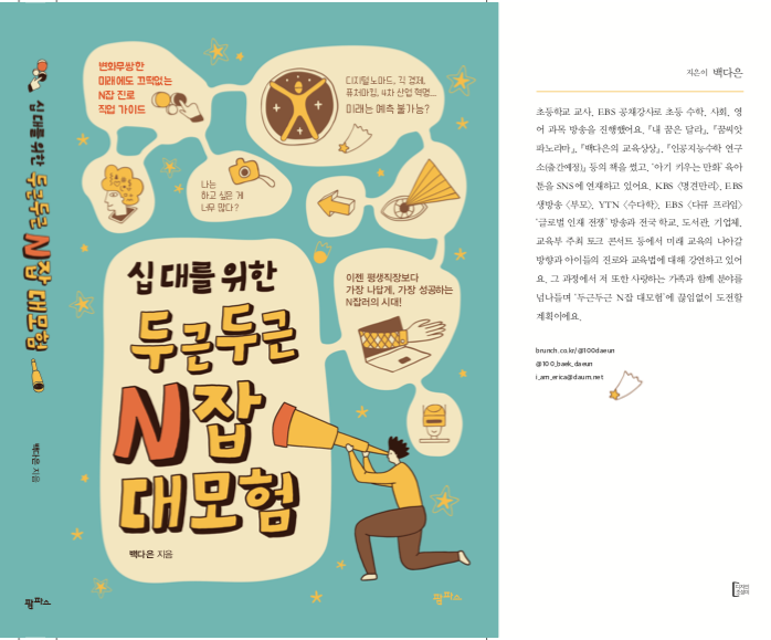 그리고 어느 순간부턴가 그 경험들이 초등학교에서 국어, 음악, 사회, 영어 등 전교과를 지도할 교사로서의 자양분이 될 것이라는 믿음도 점차 공고해졌습니다. 그 시작점을 바탕으로 교사가 되고 난 후에도 EBS 공채강사로 전국의 학생들과 방송, 온라인을 통해 만나게 된 경험, 출판사에 제안해 어린이책들을 출간해본 경험, 대기업에서 주최하는 IT 기반의 사회문제 해결 공모전에서 남편과 함께 1865개 팀 중 최종 파이널리스트에 진출한 경험, 다양한 분야의 소셜벤처를 비롯한 사회 혁신가 등과 만났던 경험 등으로 이어졌습니다. 입시지옥에 갇혀있던 시간에서의 해방만을 꿈꾸다 마침내 맞이한 스무 살의 봄, ‘이름 앞에 다양한 수식어가 붙을 수 있는 사람이 되고 싶다’고 생각했었습니다. 신기하게도 초등학교 교사라는 본업을 두고 어린이책 작가, EBS 방송 진행자, 강연가라는 이름으로 불리게 되었습니다. 그리고 모든 경험들은 자연스럽게 교육과 또다시 연결되어 수업 속에 녹아들었습니다. 선생님의 세상이 넓으면 아이들에게 가져다줄 수 있는 것, 보여줄 수 있는 것, 데려다줄 수 있는 곳이 많아질 수 있다는 말을 직접 경험하게 되었습니다. 초등학교 교사이면서 진로교육에 깊은 관심을 갖게 된 것도 이 때문이었습니다. 교실 안팎에서 만나본 다양한 사람들의 삶 자체가 살아있는 교육이 될 수 있다고 믿게 되었습니다. 만약 10대에 좀 더 일찍 다양한 경험을 하게 된다면 그것은 비단 직업을 갖는 것만이 아니라, 더 풍요로운 삶을 살 수 있게 도와줄 것입니다. 각자의 처한 상황과 희망하는 직업군 등은 다 다를지라도 삶이 던지는 질문들에 하나씩 답하며 ‘나답게 사는 인생’을 찾아가는 모험을 시작할 수 있습니다. 모험을 통해 인생의 수많은 실험을 거친 후 자기 방식대로의 삶을 살아가게 될 것입니다.