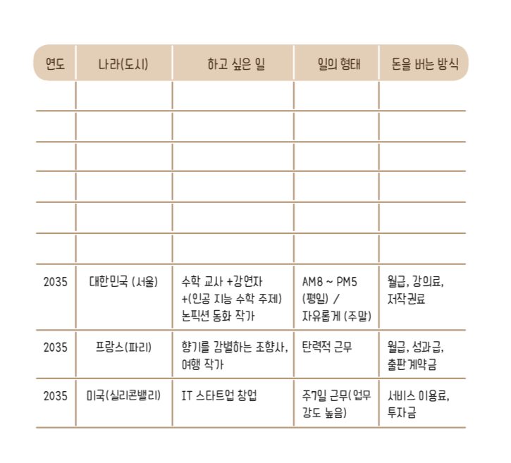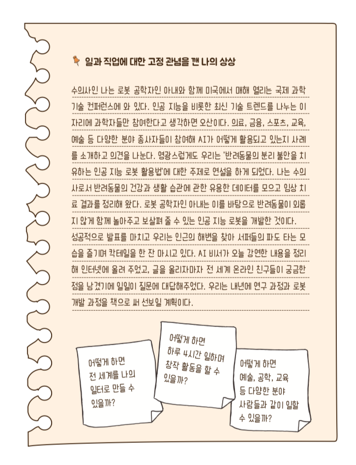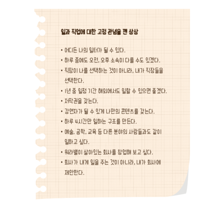 (챕터 1) 앞서 여러분에게 일과 직업에 대한 고정 관념을 깬 상상을 해보기를 주문했습니다. 그때 어떤 상상을 하였나요?