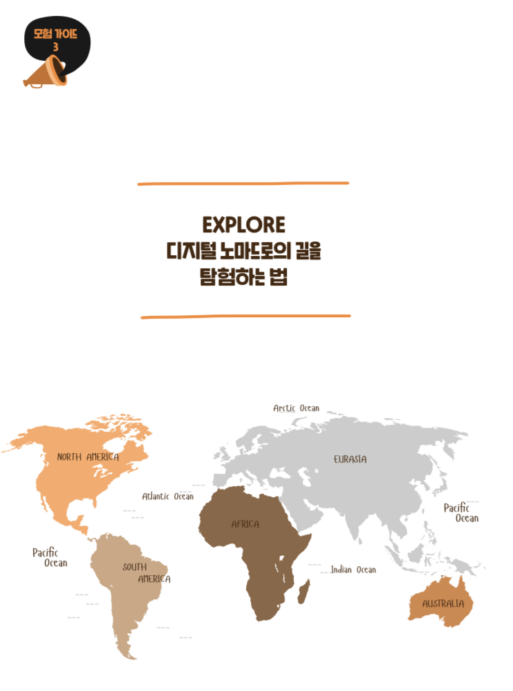 시간과 장소에 구애받지 않고 전 세계 어디서나 일하는 사람들을 ‘디지털 노마드(신유목민)’라 부릅니다. 메이크업 아티스트, 프로그래머, 기획자, 디자이너, 컨설턴트, 그림작가, 교육자 등 어떤 직업을 가졌더라도 마음만 먹으면 자신의 노트북, 스마트폰 등 디지털 기기를 이용해 어디서든 일하고, SNS를 통해 전 세계인들과 소통할 수 있는 세상이 되었죠. 여행 캐리어와 배낭을 들고 이번 달은 제주에서, 다음 달은 태국 치앙마이에서, 원하는 장소를 정해 일해 보는가 하면, 오전엔 서핑, 오후엔 그림 작업, 자신이 원하는 취미 활동도 계획할 수 있죠.