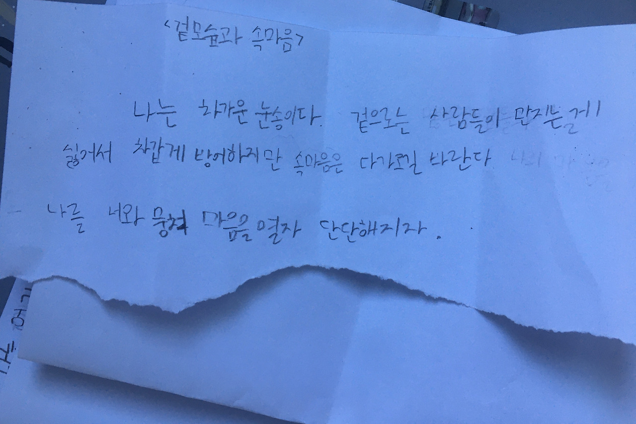 아이들은 지금껏 답이 정해진 시험지에 어른들이 원하는 정답만 적어내야만 했다. 어쩌면 자신이 원하는 진짜 이야기를 풀어내기 시작한 '처음 순간'을 맞은 건지도 모른다는 생각이 들었다. 가까이 지내던 친구들 역시 서로의 속마음을 듣고는 "ㅇㅇ이에게 그런 면이 있었어?" 놀라움을 감추지 않았다.
