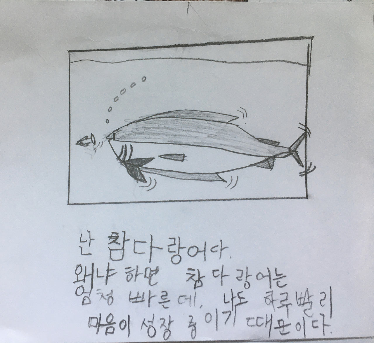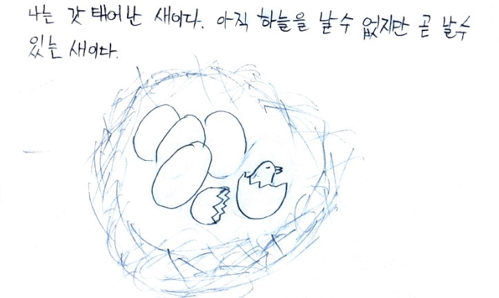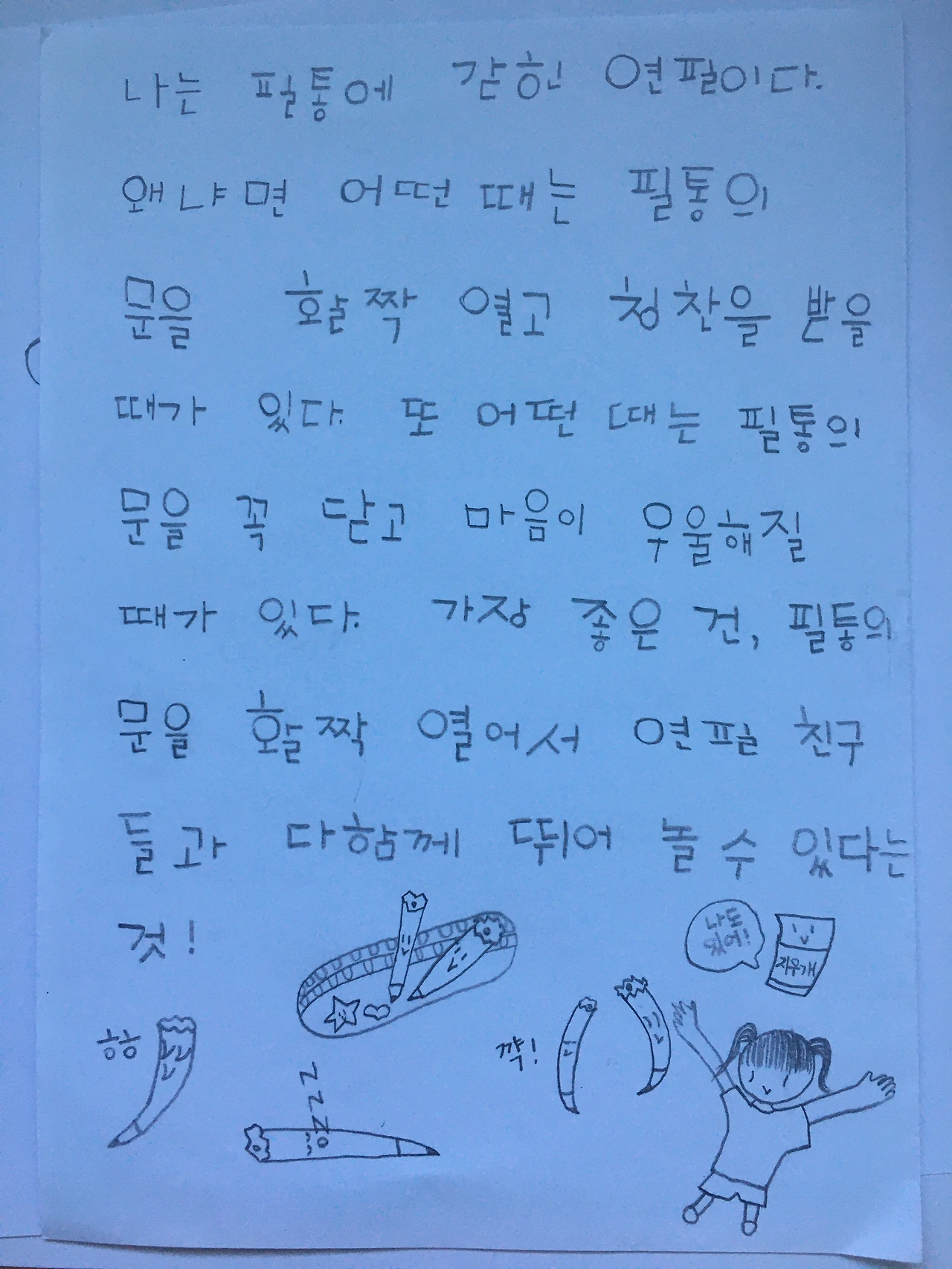 똑소리나는 민현이에게 이런 글이 나올 거라곤 사실 예상치 못했다. '필통에 갇힌 연필'이라.. 아이들에게 누가 쓴 글인지는 알려주지 않았다. 대신, 이 단어가 주는 느낌에 대해 물었다. 그냥 연필도 아닌 필통에 갇힌 연필 하니, 이이들은 뭔가 외롭고, 답답하고, 슬픈 느낌이었을 것 같다고 했다.
