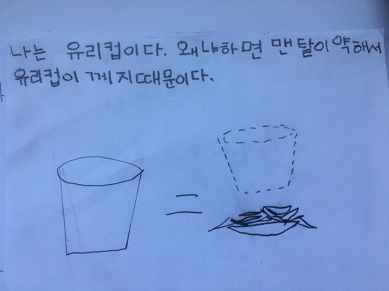 '나는 유리컵이다. 왜냐하면 멘탈이 약해서 유리컵이 깨지기 때문이다.