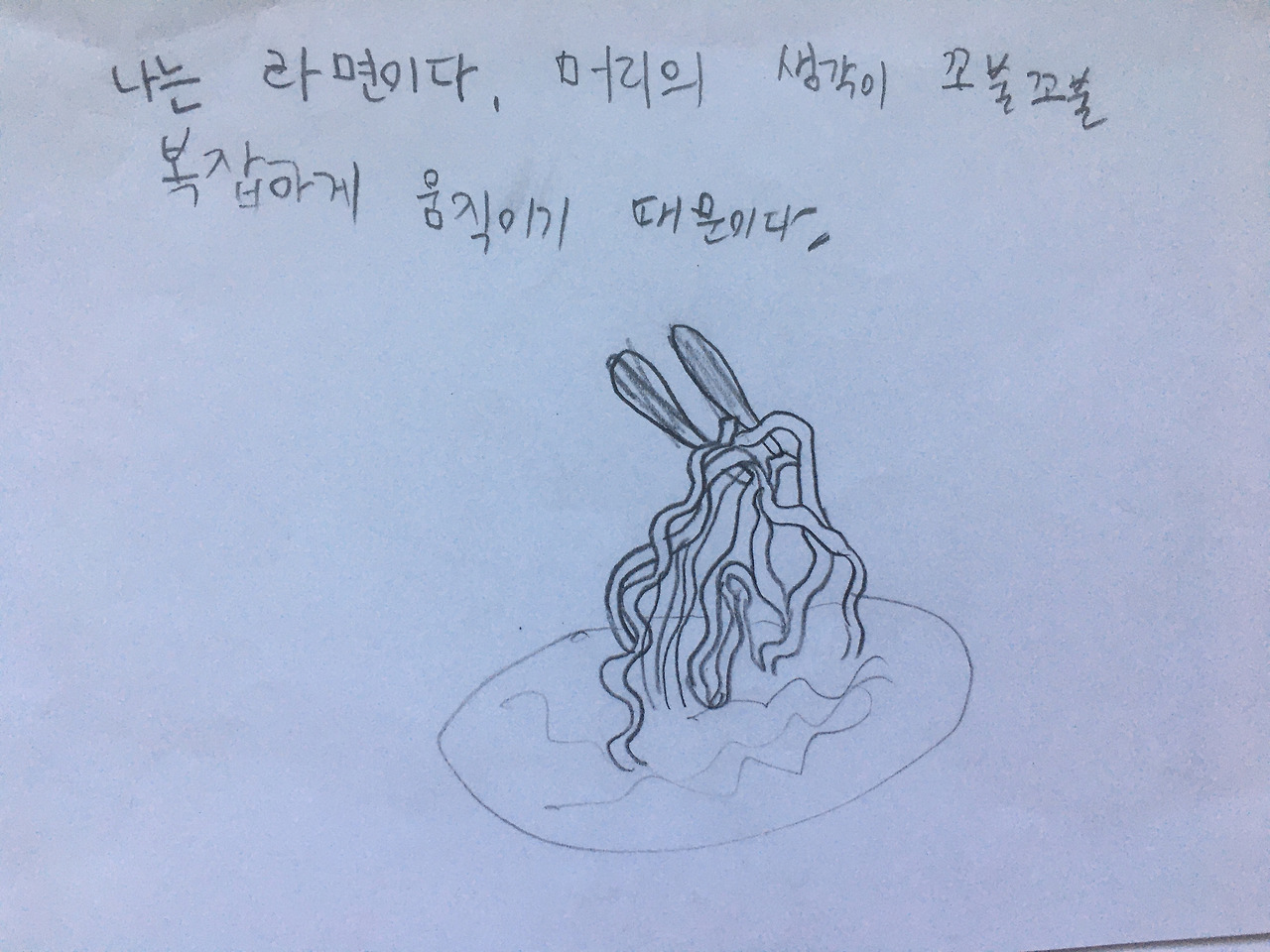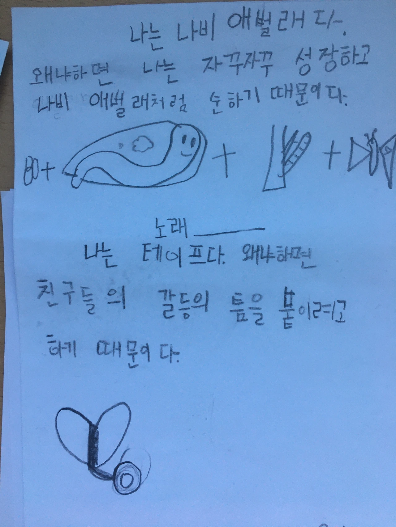 친구와 다투고 난 후 속상한 마음을 구겨진 종이에 비유한 아이도 있었다. 고등학교 국어교사인 친구에게 보여주었더니 이렇게 말했다. "초등학교 2학년이 쓴 글 맞아? 토이나 아이유 노래가사 같다. 종이가 구겨졌을 때 흔적을 상처와 연결짓고, 펴도 남아있는 그 자국을 이렇게 표현하다니.."