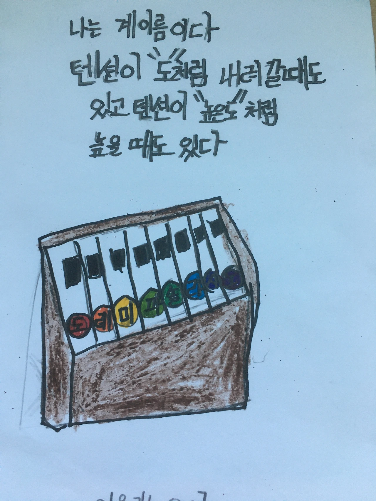 이 때다 싶어 그림책을 연구하는 선생님으로부터 배워둔 '은유거울' 활동을 위한 시동을 걸었다. '은유거울'이란 나를 하나의 사물이나 색, 음계, 동식물 등에 빗대어 표현하는 활동이다.