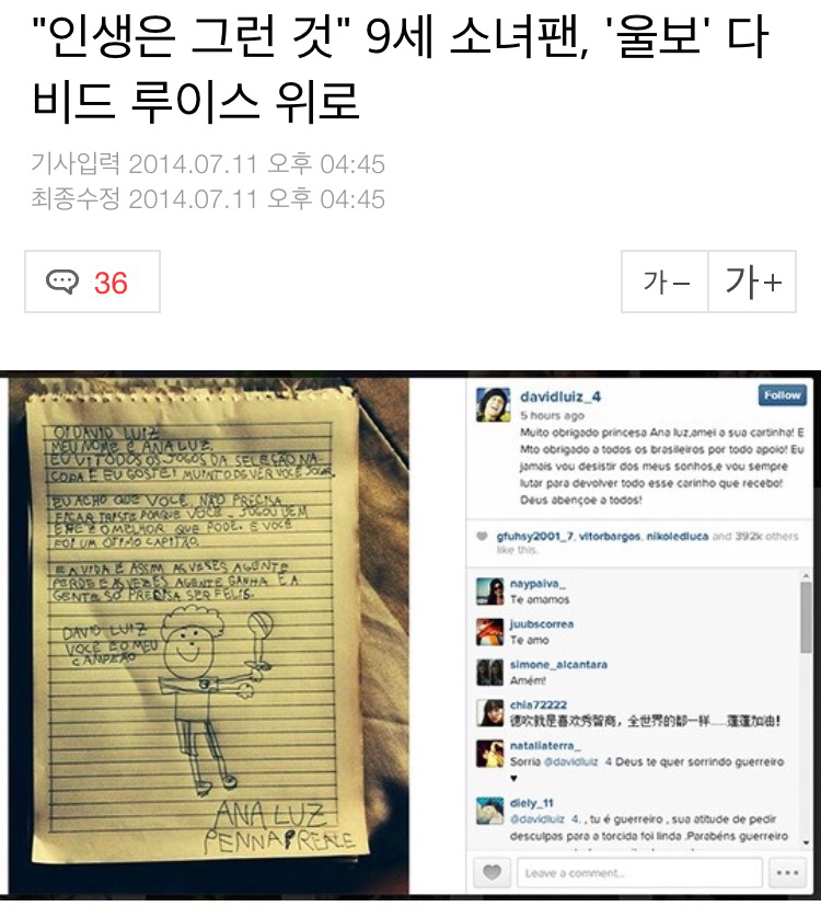 독일과의 2014 브라질 월드컵 4강전서 1-7로 대패한 뒤 울음을 터뜨린 축구선수 다비드 루이스가 9살 소녀팬에게 한 통의 편지를 받았습니다.