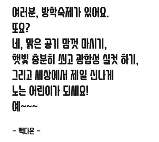 그 말이 끝나기가 무섭게 교실은 환호성으로 넘쳐났습니다. 친구와 손뼉을 치고, 책상을 두드리며 기뻐하는 그 제각각의 반응들을 바로보던 저는 그날도 웃음을 참지 못해 칠판 쪽을 향해 뒤돌아서서 쉴새없이 새어나오는 웃음을 참아야 했습니다. 쉬는 시간을 알리는 종이 울리자마자, 벌써 옆반 친구에 쪼르르 달려가서 "우리반 방학 숙제는 세상에서 제일 신나게 노는 어린이 되기다!" 말하기 바빴고, 복도에는 그 소리가 울려퍼졌습니다.