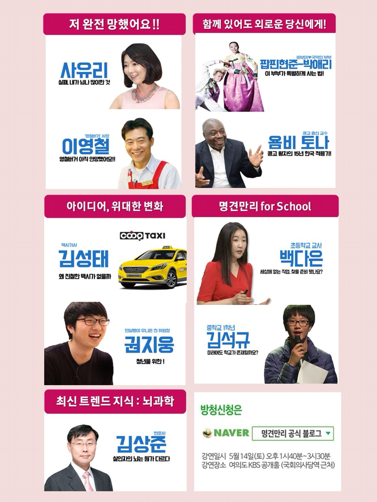 KBS 명견만리에 ‘세상에 없는 직업, 만들 준비 됐나요?’ 주제로 발표하기 위해 출연했을 때의 일입니다. 같은 날 석규라는 이름의 한 중학생 역시 프리젠터로 참여하였는데, 대기실에서 이야길 나눠보니 이 친구는 이미 초등학교 때 이 프로그램에서 방청객으로 참여하였다가 크게 화제가 된 적이 있었던 유명 인사였습니다.