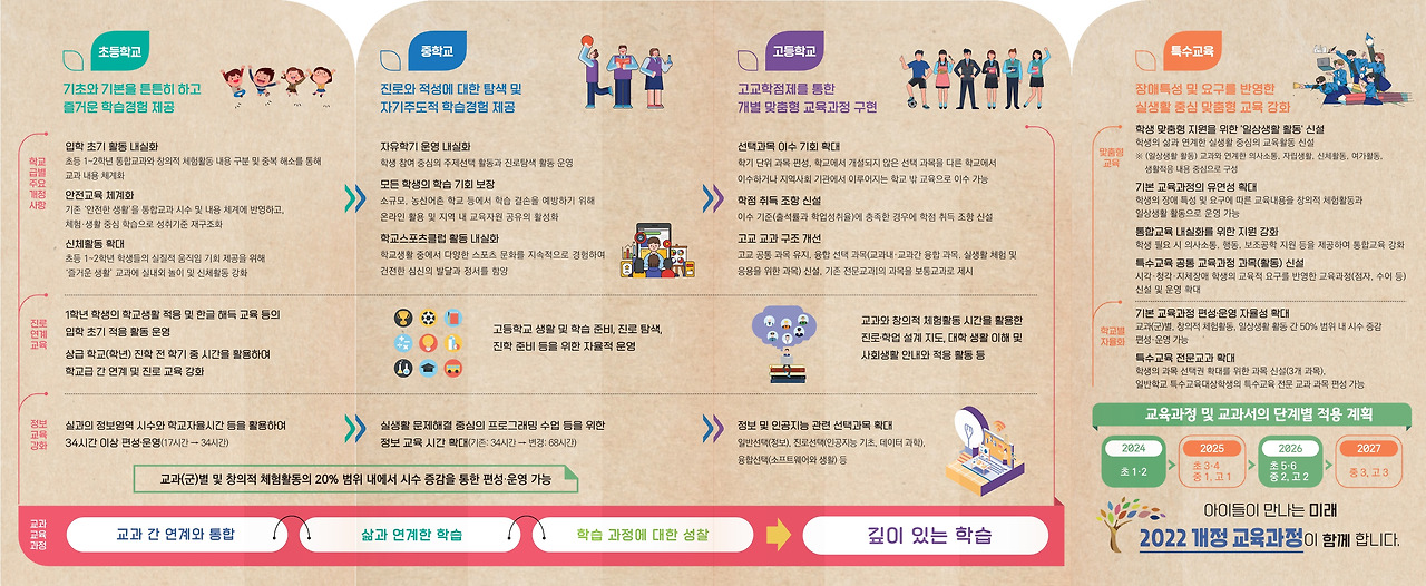 - 초등 저학년 통합교과와 창의적 체험활동 내용을 구분, 체계화하고 국어 교과 시수를 확대하는 방향으로 재구조화