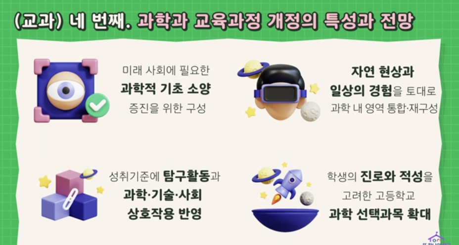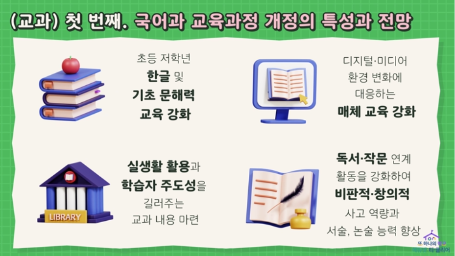 기존의 3R(읽기 쓰기 셈하기)에서 벗어나 '언어', '수리', '디지털 소양' 등이 강조되는 교육이 이뤄진다. 2015 교육과정의 역량 함양교육을 체계화하고 생태전환교육, 인공지능과 디지털 소양 등 기초소양 교육이 강화될 예정이라는 점이 눈에 띈다.