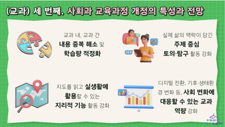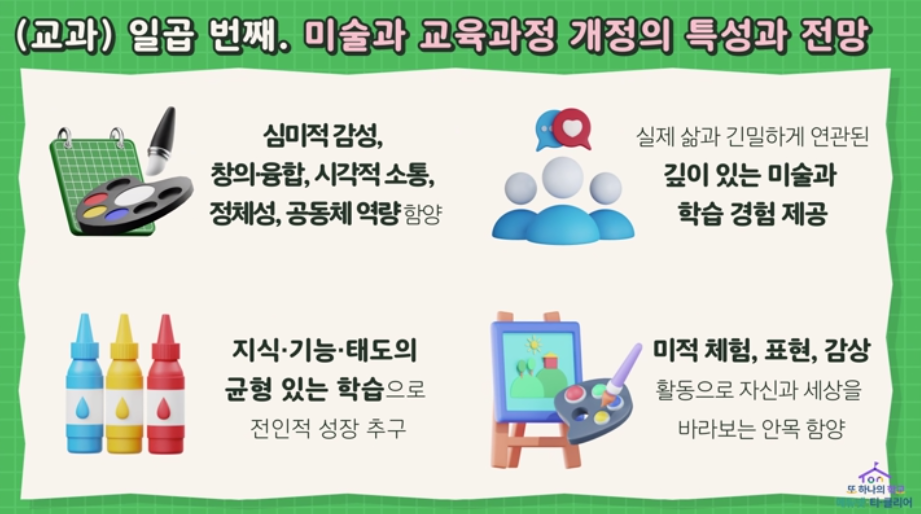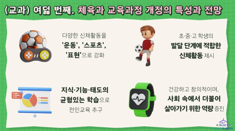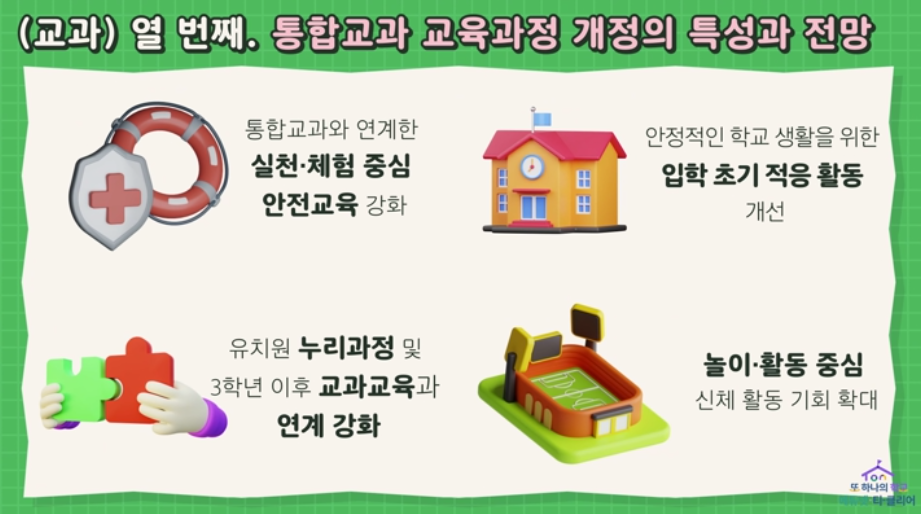 초등 1~2학년 통합교과와 창의적 체험활동 내용 구분 및 중복 해소를 통해 교과 내용 체계화 안전교육 체계화 기존 ‘안전한 생활’을 통합교과 시수 및 내용 체계에 반영하고, 체험·생활 중심 학습으로 성취기준 재구조화 신체활동 확대 초등 1~2학년 학생들의 실질적 움직임 기회 제공을 위해 ‘즐거운 생활’ 교과에 실내외 놀이 및 신체활동 강화