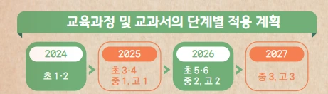 2024년 초 1,2 / 2025년 초 3,4, 중1, 고1 / 2026년 초 5,6 / 2027년 중3, 고3 순서대로 단계별로 적용된다.