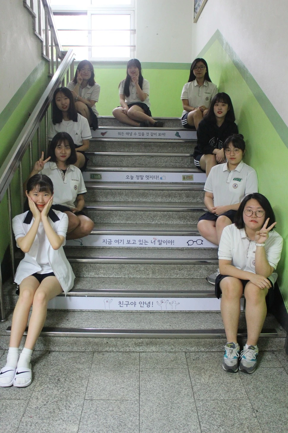 학교 계단에도 위로와 공감 메시지를 나누었습니다. ‘세상은 호락호락하지 않대, 하지만 괜찮아, 나도 호락호락하지 않으니까’, ‘지금 많이 힘들어? 그런데 신은 견딜 수 있을 고난만 준대, 넌 참 큰사람인가보다’, ‘문어지지마, 내가 보기보단 강아지, 인생은 다 그런 고래, 이 또한 지나가오리’ 등의 문구를 아기자기한 그림과 함께 담았습니다.