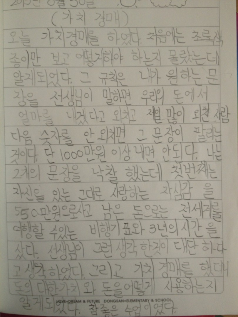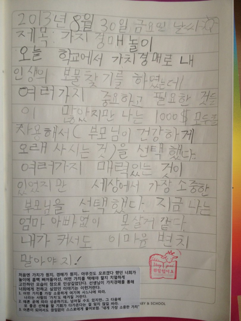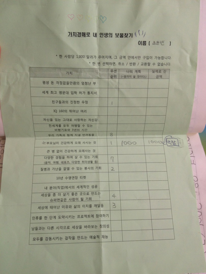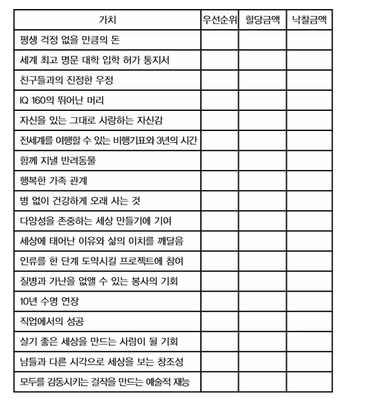 1달러가 1000원이라고 치면 무려 100만원이잖아. 그 많은 돈으로 무엇을 사지? 예쁜 가방을 살 까? 옷을 살까? 목걸이를 살까? 알고 보니, 1000달러는 가상의 돈이었어. 그럼 그렇지. 우리는 각자에게 주어진 1000달러로 꿈을 이루는 데 필요한 가치들을 낙찰받는 시간이었어. 처음 해 보는 가치경매였으니, 무턱대고 뛰어 들었다간 낭패를 보기 십상일 테지.