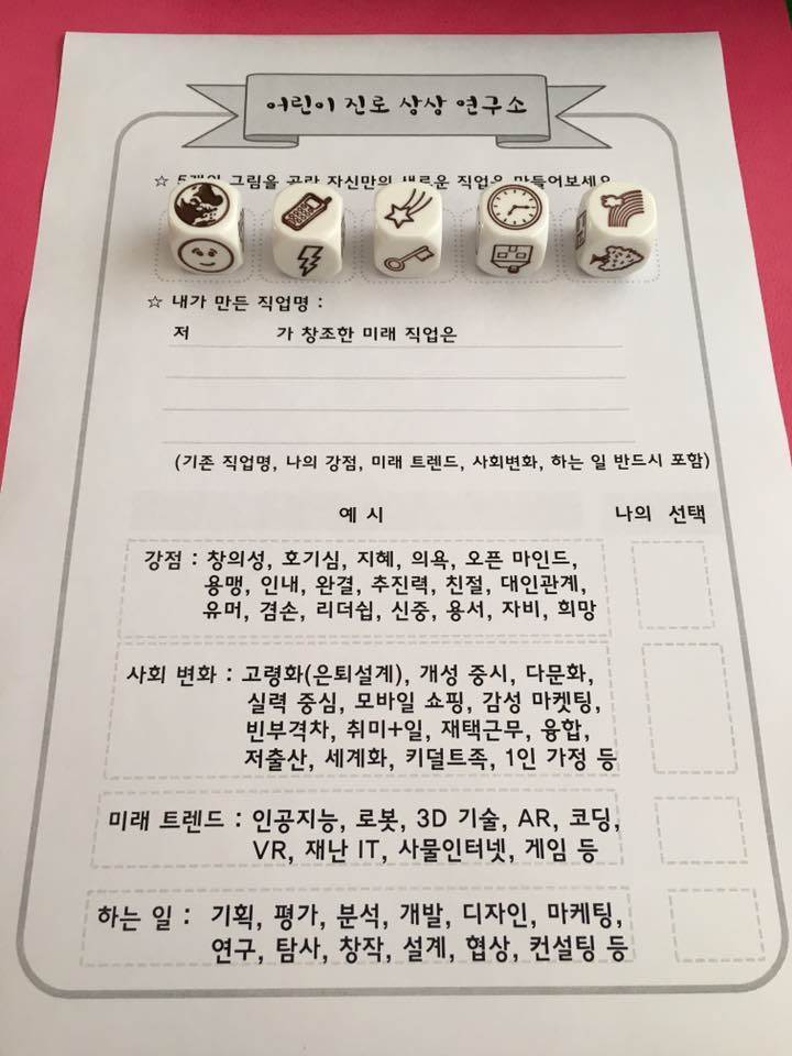 꾸준한 연구를 거듭하며 미래 트렌드 원형 휠을 만들었고, 미래 유망직업 카드 등을 활용하여 수업하였습니다. 내적인 힘을 길러주는 강점카드, SCAMPER 발명 기법 등을 활용한 직업명 네이밍, 진로교육 워크북 등을 잇달아 개발해 수업에 활용해보았습니다. 또한 단순한 직업명을 떠올리는 것에서 그치지 않고 스토리큐브라는 창의성 도구를 활용하여 자신이 만들어낸 직업과 관련한 직무, 가치관, 일상 등을 담아 이야기를 만들 수 있는 스토리텔링 수업을 시작했는데, ‘어린이 진로상상 연구소’ 내에도 작은 변화가 일어났습니다.
