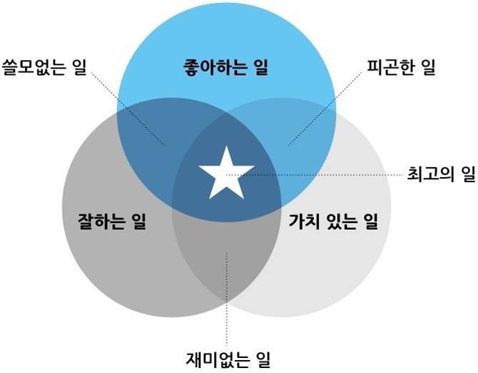 원래 좋아하고, 잘하고, 가치까지 있는 일인 천직을 찾는다는 건 쉬운 일이 아니니까요. 우스갯소리로 좋아하면서 가치있는 일이지만 잘하지 못하면, 피곤한 일. 잘하고 가치있는 일이지만 정작 좋아하지 않으면 재미없는 일. 잘하고 좋아하지만 가치없으면 쓸데없는 일이라는 말이 있습니다. 이 3가지를 모두 충족하기란 결코 쉽지가 않습니다.