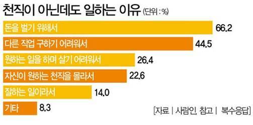 천직이 아니라고 생각하면서 일을 하는 이유를 묻는 질문에는 66.2%(복수응답)가 ‘돈을 벌기 위해’라고 답했습니다. 생업에 해당하는 거죠. 이어 '원하는 일을 하며 살기 어려워서(26.4%)', '자신이 원하는 천직을 몰라서(22.6%)'라는 답변이었습니다.