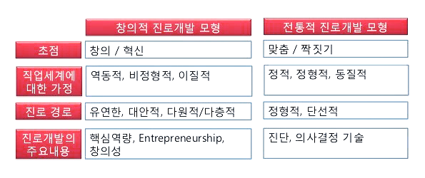 창의적 진로개발 모형은 급격히 변화하는 직업 세계, 고용 없는 성장이 심화되는 상황에 적극적으로 대응하고자 만들어졌습니다. 새로운 변화를 이해하며 다양한 아이디어를 통해 그에 적응, 직업을 스스로 만들어나가며 자신의 길을 개척해갈 수 있도록 지원하는 모형입니다. 그 실행과정을 담은 글도 함께 공유합니다.