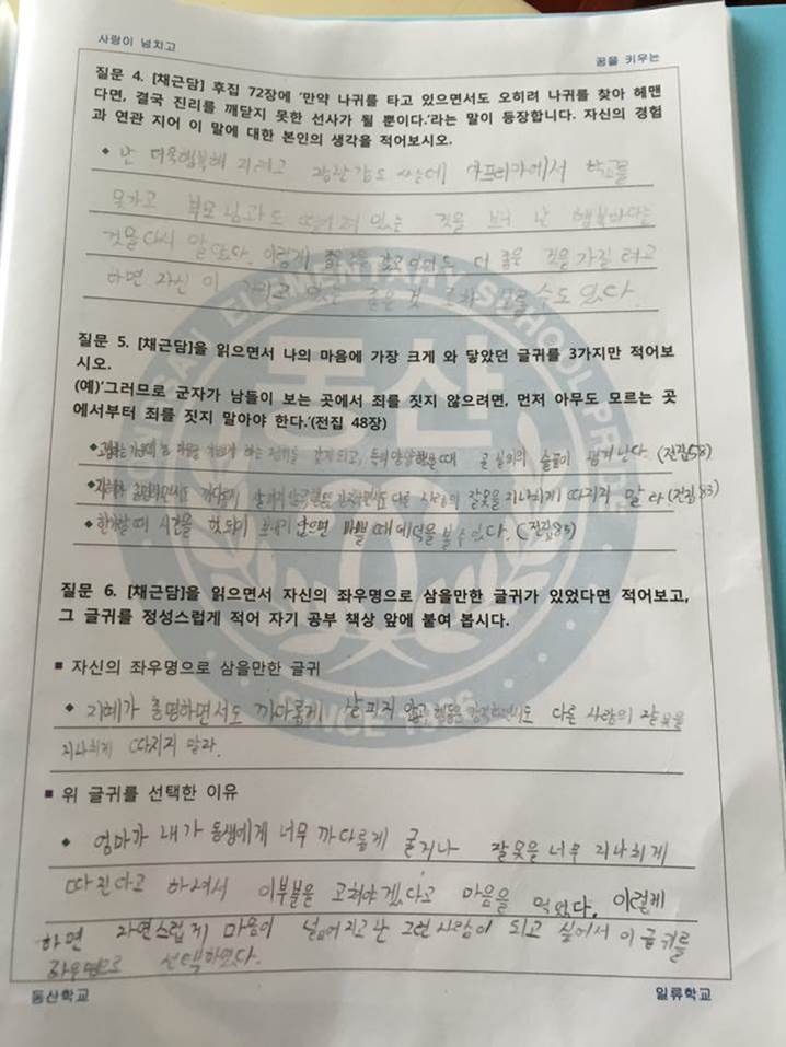 그런 의미에서 '교사들에게는 히포크라테스 선서가 없을까'라는 생각을 해 본 적이 있었습니다. 그리고 교사들은 물론 아이들에게도 각자 자신을 바로세우고 마음을 다잡을 수 있는 문구가 있으면 참 좋겠다 고민하던 차에 SNS에서 진숙자 선생님의 이 글을 우연히 만나게 되었습니다.