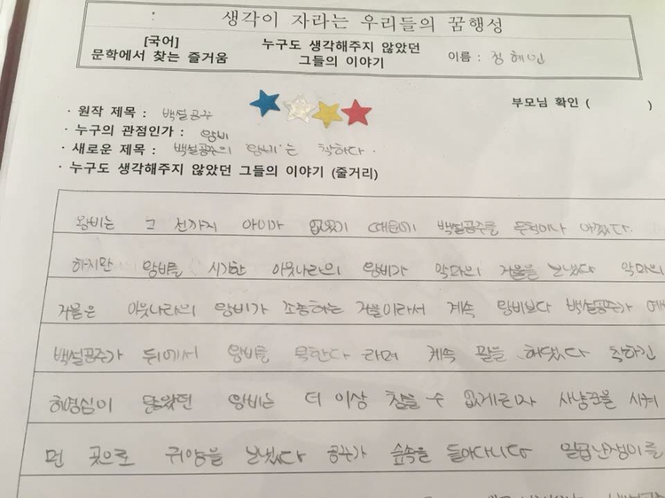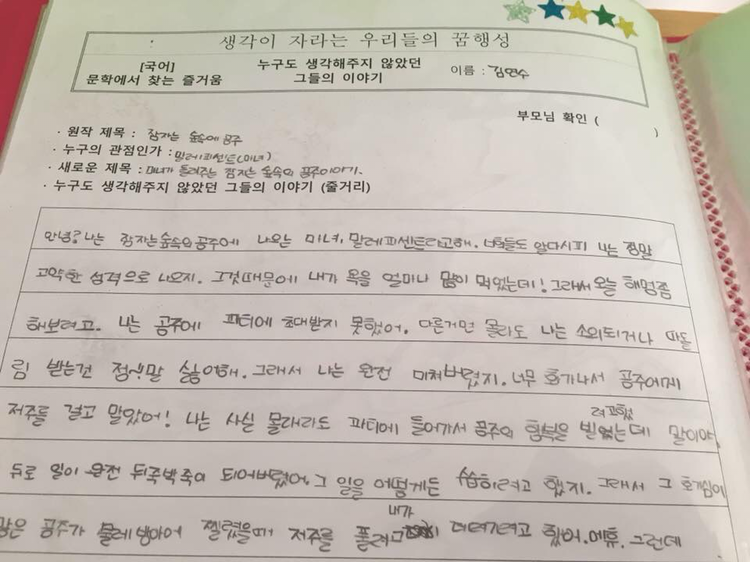 교실에서 이 책을 함께 읽은 다음 날, 아이들에게 자신이 잘 알고 있는 명작 중 하나를 골라 주인공이 아닌, 그간 누구도 생각해주지 않았던 이들의 이야기를 대변해 시나리오를 써볼 것을 주문했습니다. 아이들은 ‘잠자는 숲 속의 공주’, ‘해와 달이 된 오누이’ ‘신데렐라’ ‘흥부놀부’ ‘키다리 아저씨’ 등 저마다 또다른 주인공을 앞세운 스토리텔러가 되기 시작했습니다.