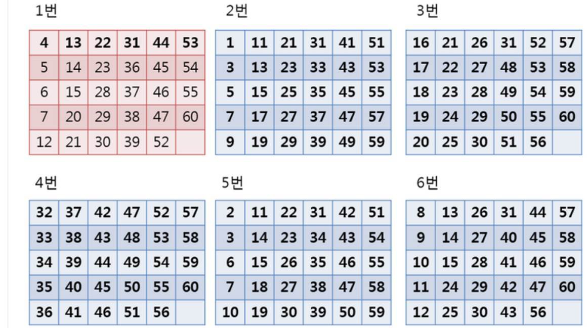 사실 방식은 간단합니다. 만약 반 아이들이 26을 정했다고 가정해보죠. 6장의 카드 중 숫자 26이 있는 카드는 3,5,6번이잖아요. 저는 실물화상기로 한 장씩 비추며 “이 카드에 여러분이 정한 그 숫자가 있나요?” 물어보면 됩니다. “예”라고 대답하는 카드만 따로 모아보면 이 3장 카드의 맨 앞의 숫자를 모두 합해 16+2+8 = 26 임을 알게 되는 방식입니다.