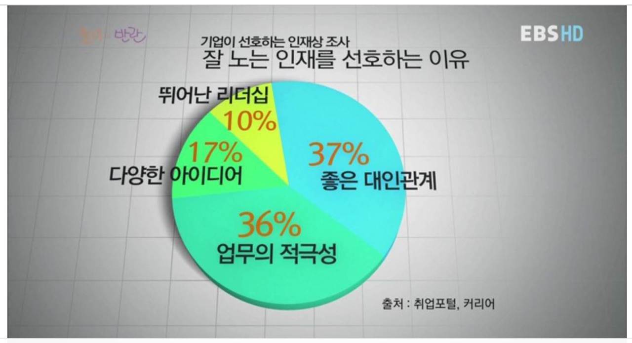 한 취업포털사이트에서 실시한 설문조사에서 잘 노는 인재를 기업에서 선호하는 이유를 묻자, 좋은 대인관계 (37%), 업무의 적극성 (36%), 다양한 아이디어 (17%), 뛰어난 리더십 (10%)를 꼽았다고 합니다. 놀이는 개인적으로 충만한 삶을 위해서는 물론, 일이나 사업적인 측면에서도 큰 힘을 발휘한다는 걸 알 수 있게 하는 대목입니다.