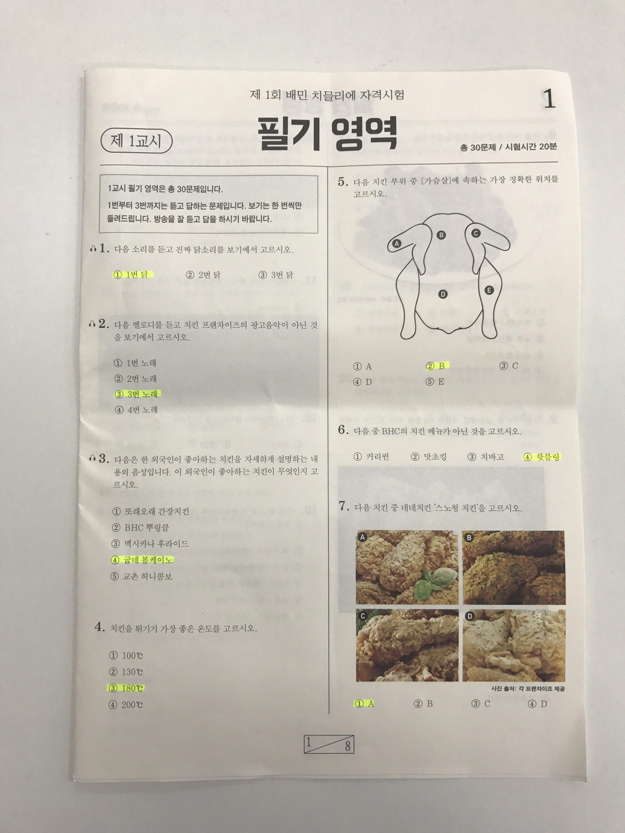 치킨에 대한 모든 것을 감별하는 ‘치믈리에 자격시험’은 1교시 필기시험과 2교시 실기시험으로 진행되었습니다. 필기시험은 치킨 부위를 그림을 보고 고르거나, 치킨 브랜드별 제품 특징을 꿰고 있어야 맞출 수 있는 문제들로 구성되어 있고, 실기시험은 12종의 치킨을 블라인드 테스트로 직접 맛으로 가려내야하는 방식이었습니다.