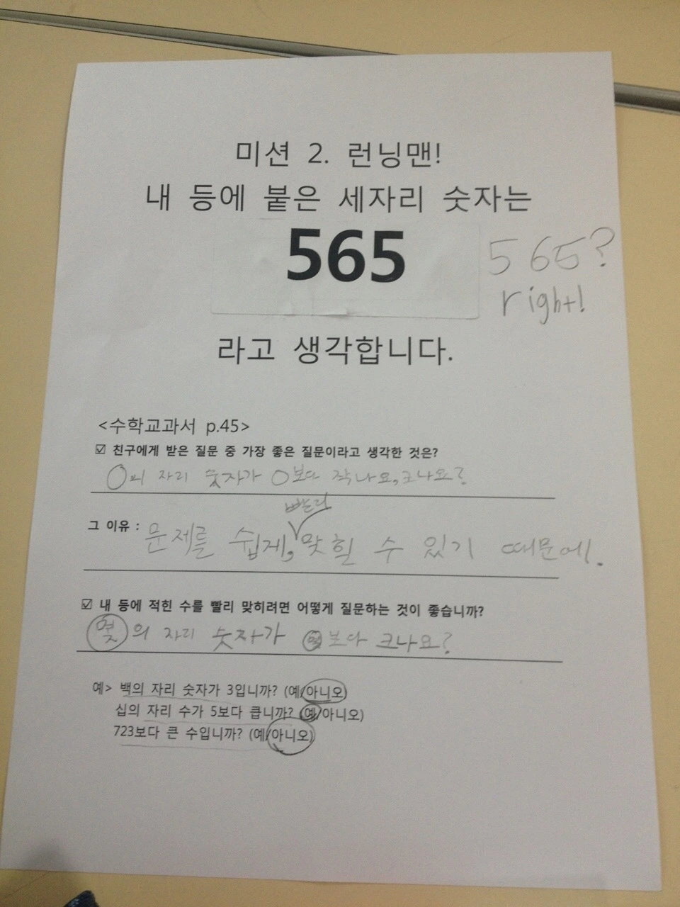 점점 범위를 좁혀갑니다. 정답에 가까워질수록 아이들은 눈빛이 흔들리고, 책상을 치고, 다리를 흔들고 교실 안 긴장감은 최고조에 이릅니다. 그렇게 마음이 찌릿찌릿 통하는 우리만의 시간이 무르익어갑니다.