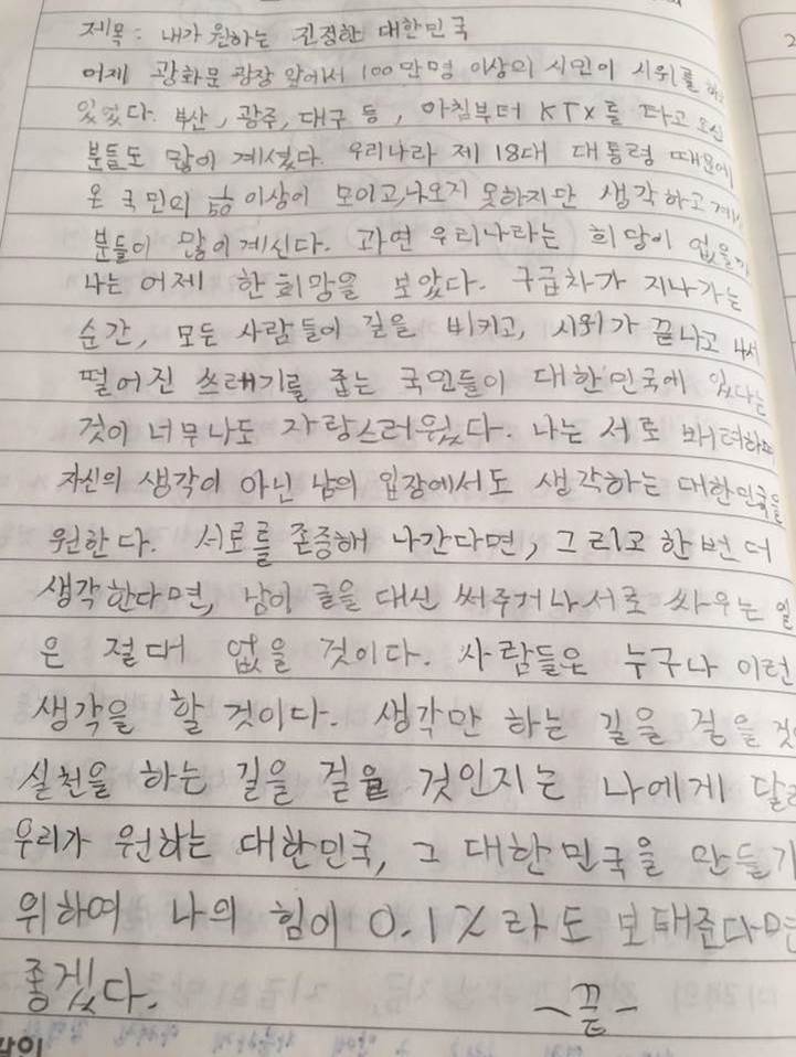 한 아이는 ‘내가 원하는 대한민국’ 주제 발표에서 광화문 광장에서 구급차가 지나가는 순간, 모든 사람들이 길을 비키고, 길에 떨어진 쓰레기를 줍는 성숙한 시민들의 모습 보며 희망을 보았다고 했습니다. 그리고 자신이 꿈꾸는 대한민국의 모습은 이렇게 서로 배려하고 존중하는 모습이라구요.