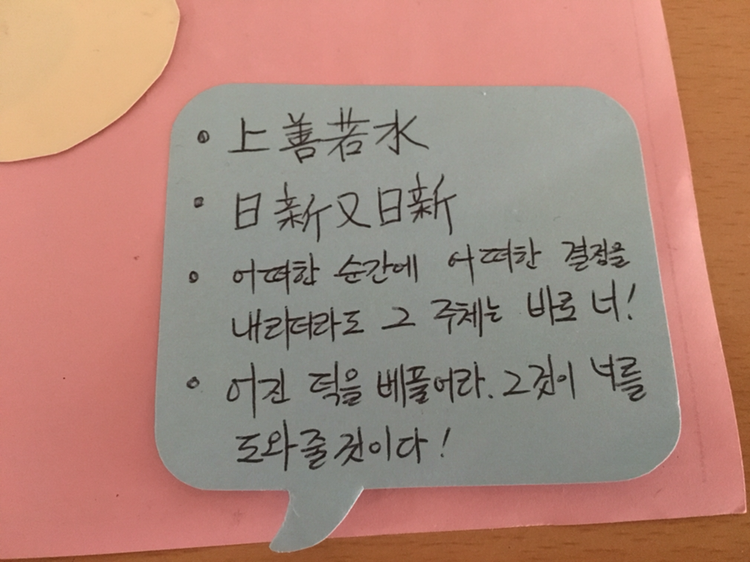 상선약수 일신우일신. 어떤 순간에 어떠한 결정을 내리더라도 그 주체는 바로 너! 어진 덕을 베풀어라.