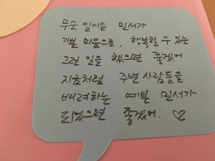 친절하게 대했으면 좋겠어. 더 자신감있게 얘기하고, 먼저 포기하거나 두려워하지 마. 언제나 행복했으면 좋겠어! 민서야, 파이팅!