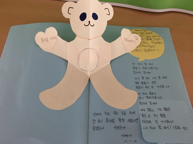 한 학년을 마무리하던 12월, 크리스마스를 앞두고 아이들과 둥그렇게 둘러앉았습니다. 그리고 아이들 한명 한명에게 여권 케이스와 편지를 선물로 주었습니다. 머지 않아 우리 국제공항에서 같이 만나자고요. 보다 넓은 세상을 꿈꾸라는 의미에서 말입니다.