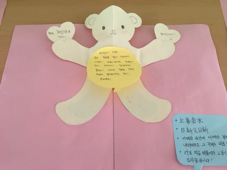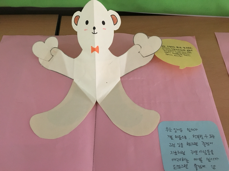 반 아이들과도 이 책을 읽고 자신이 추구하는 가치는 무엇인지 생각해보고, 부모님께도 응원의 메세지를 받아올 수 있게 하였습니다.
