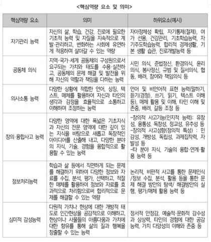 자기관리, 지식정보처리, 창의적 사고, 심미적 감성, 의사소통, 공동체적 역량 등 6가지 핵심역량이 제시된 것입니다.