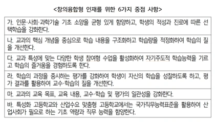 이러한 핵심역량을 함양해 도달하고자 하는 인재상으로는 ‘바른 인성을 갖춘 창의융합형 인재’가 제시되었으며, 이를 위해 다시 6가지의 중점 사항이 교육과정 총론에 구체적으로 명시됐습니다.