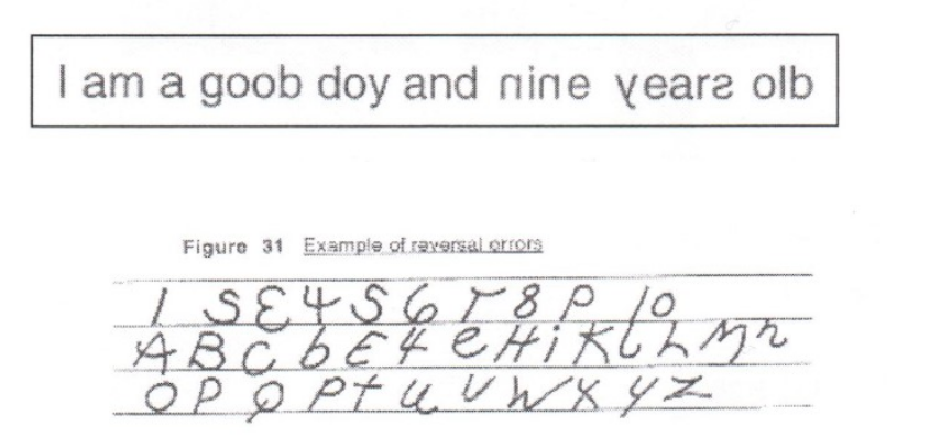 또한 이샨처럼 b와 d 같은 방향성을 가진 글자를 제대로 기억하고 쓰는 것이 어려운 경우를 운동표현성 난독증이라고 합니다. 이는 ‘소뇌와 전정기관의 문제로 감각-운동통합기능이 떨어져서 대근육 운동과 소근육 운동이 통합적으로 이루어지지 않아서 생긴 현상’이라는데, 아래는 이샨과 비슷한 난독인이 쓴 글입니다. 실제로 b와 d나 n, y의 방향성이 틀리고, 대소문자도 틀리게 적힌 것을 관찰할 수 있습니다.