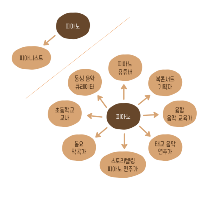 사실 그동안은 일직선으로 쭉 뻗은 사다리형 커리어가 성공의 방정식으로 통했습니다. 하지만 현대 사회에서 말하는 천직은 태어날 때부터 정해진 단 하나의 것이 아니라, 자기 자신에 맞게 ’만들어가는 것’에 가깝습니다. 피아노를 친다고 모두가 피아니스트가 될 수는 없고, 그렇게 되어야 하는 것도 아니니까요.