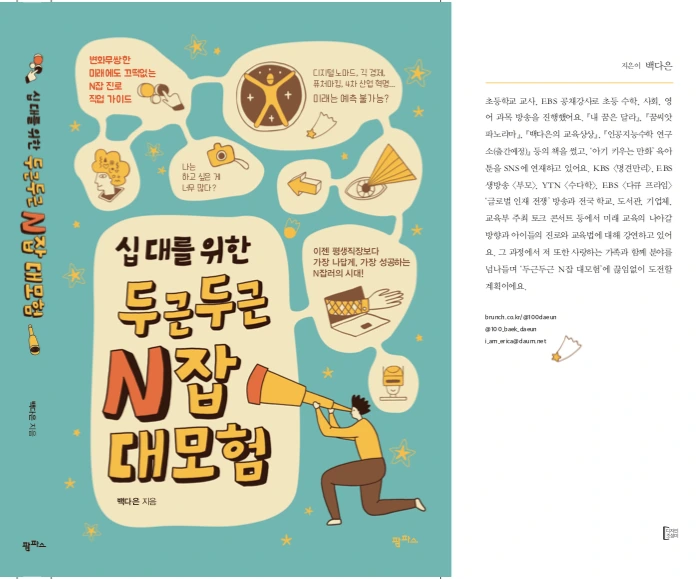 이 책에서는 단순히 많은 직업 개수를 가져야 한다고 말하지 않을 것입니다. N잡러가 되기 위한 모험은 내가 누구인지 찾아가는 소중한 여행이 될 것이기 때문입니다. 내가 즐겁고, 더 나아가 다른 사람들에게도 기쁨과 영감을 줄 수 있는 나다운 삶을 어떻게 꾸려나갈 것인가에 대한 자신만의 답을 찾아가는 셈이죠. 그리고 그 과정에서 매일 새롭게 한뼘씩 자라고 있을 '나만의 천직’과 만나게 될 것입니다. 어느 날 거짓말처럼 눈앞에 짠 하고 나타날 수도 있겠지만, 운명이라기보다는, 잘 가꾸고 키워 나가는 것에 가깝지 않을까요?