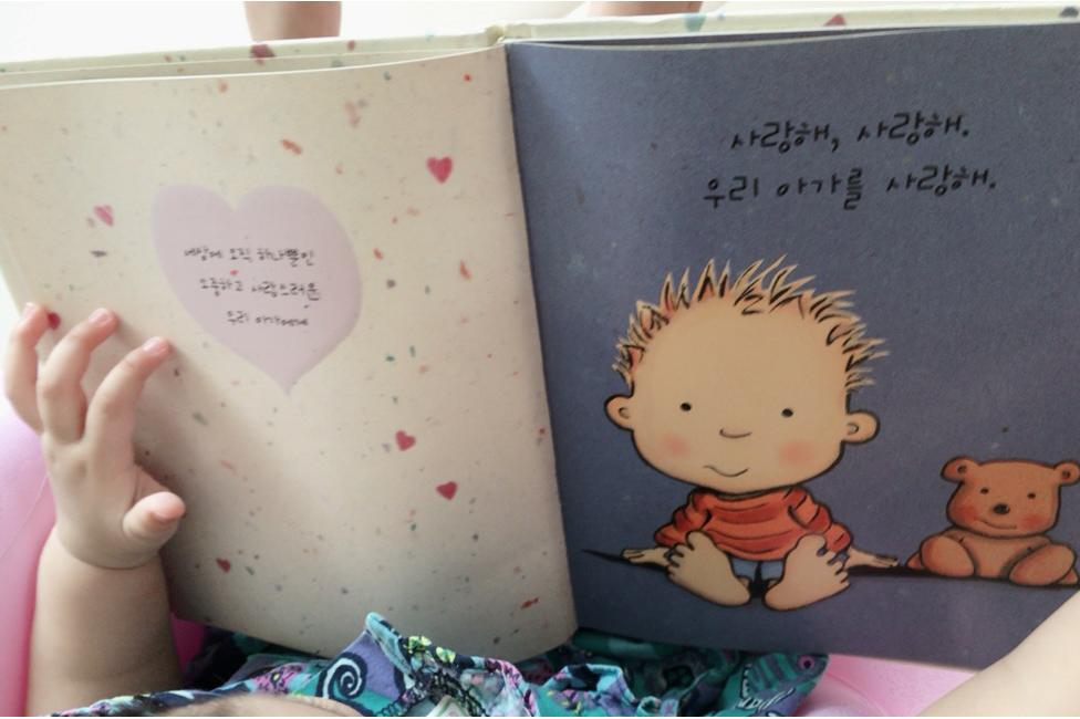 그래서 나는 오늘도 패런티즈(parentese) 화법으로 그림책을 읽어주고 있다. ‘사~아랑해 너~얼 사아라앙해’ ‘머리끝부터 바아~알끝까지, 너~~어어어를 사~아랑해’, 평상시 목소리 톤보다 높고 단어를 천천히 길게 늘이며 읽는 법을 말한다. 이런 방식으로 읽어주었을 때 아이는 날 평소보다 더 반짝이는 눈빛으로 바라보면서 '헤에' 소리를 내며 웃는다. 아이가 생기면 꼭 읽어주고 싶었던 그림책 '사랑해 사랑해 사랑해', 더없이 사랑스럽다. 읽고 또 읽어주어도 부족함을 느낀다.