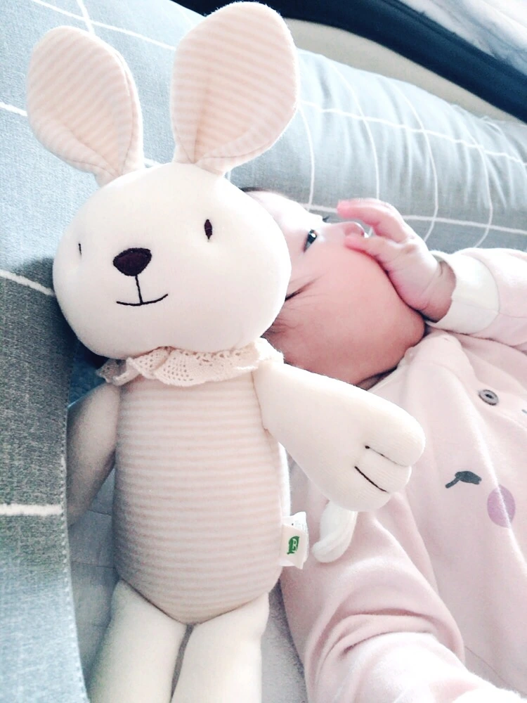 그렇게 유기농 오가닉 원단의 토끼 인형 하나는 유모차 전용으로, 양 모양의 베게는 베이비 가드가 자리잡은 거실에 넣어두었다. 아직까지는 어리다보니 특별한 애착을 갖는 것으로 보이진 않는다. 폭신하고 부드러운 촉감을 좋아해 가끔씩 물고 빨거나, 외출 때 유모차에서 낮잠 친구가 되어주거나, 조그만 손으로 쓰담쓰담 만지며 만족스러운 듯 웃는 정도가 아직은 전부다. 부모가 아이와 충분한 애착관계를 형성한 생후 12개월 이후 정도가 애착인형과 친해질 적당한 시기라 하니, 좀 더 기다려보기로 했다.