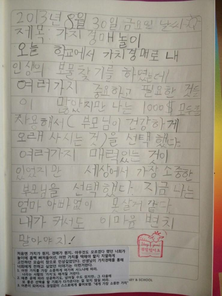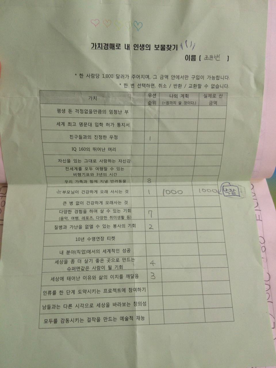 우리가 살아가는 데 있어 가장 중요한 가치는 무엇일까요? 다양한 답변이 나올 거에요. 저희반 애들하고 ‘가치경매’라는 활동을 해 본 적이 있는데요. 이 중에서 가장 많은 답을 얻은 것을 모아보면 ‘행복’이었습니다.