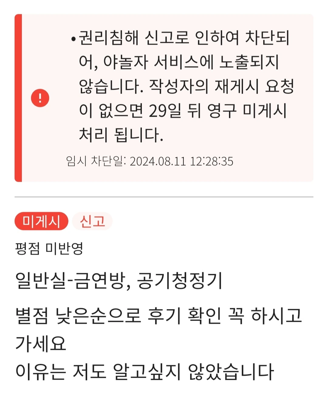 부당한 리뷰인 경우 권리침해신고로 해당 리뷰가 블라인드 처리되고 평점에 반영되지 않는다.