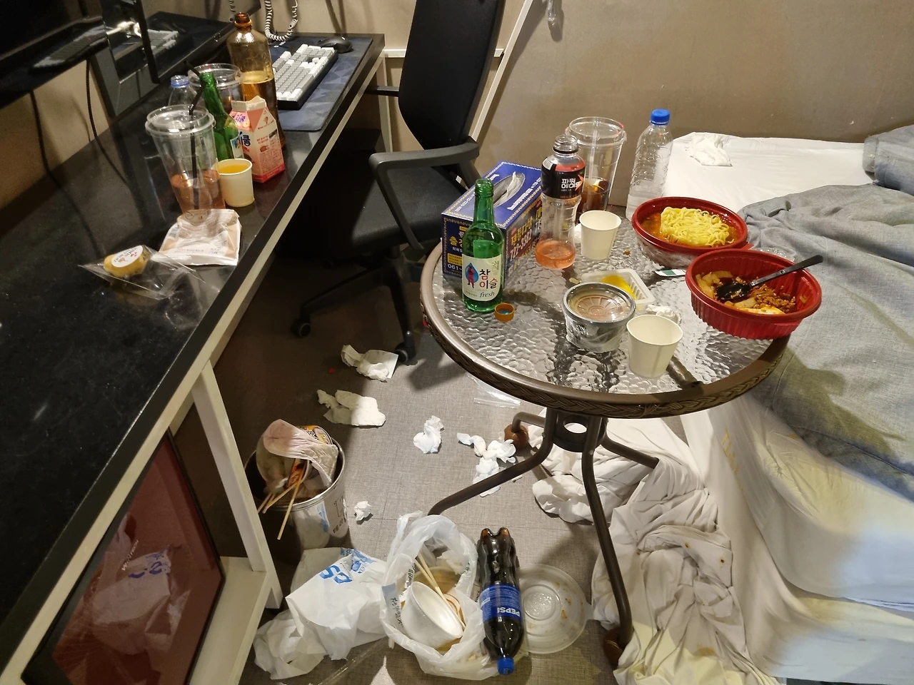 나는 고객의 명령조의 말투와 연박의 특성을 악용해 부러 아랫단계의 방을 예약한 행동이라 화가 나서 그리했다고 말했어. 그들이 방을 옮기는 찰나 오후 6시는 엘리베이터 점검 중이었으므로 계단을 이용해 퇴실한 608호에 가보았는데 방이 가관이었어. 하지만 이미 301호에 입실시킨 상태로 없는 일로 치고 청소를 했지.