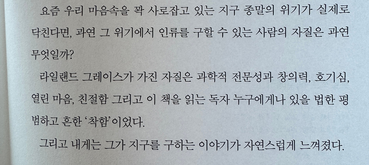 현실은 때로 정반대로 흘러가고, 뉴스 속 인간 사회는 불신과 피로로 가득하다. 그러나 『프로젝트 헤일메리』는 그럼에도 희망을 보여준다. 과학과 인간애가 함께할 때, 우리는 끝내 살아남을 수 있다는 믿음. SF 소설을 넘어, 현재를 살아가는 우리에게 절실한 메시지였다.